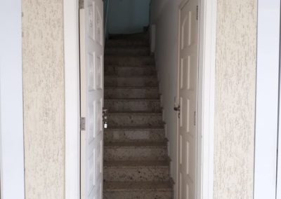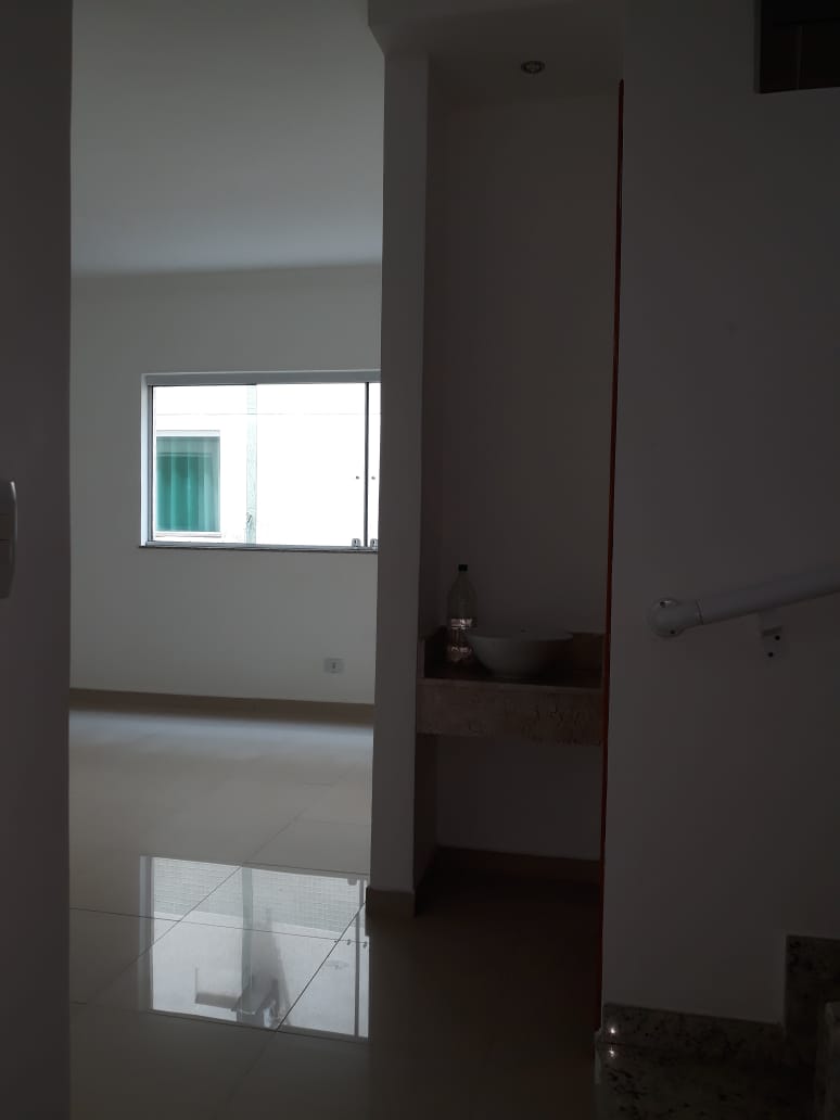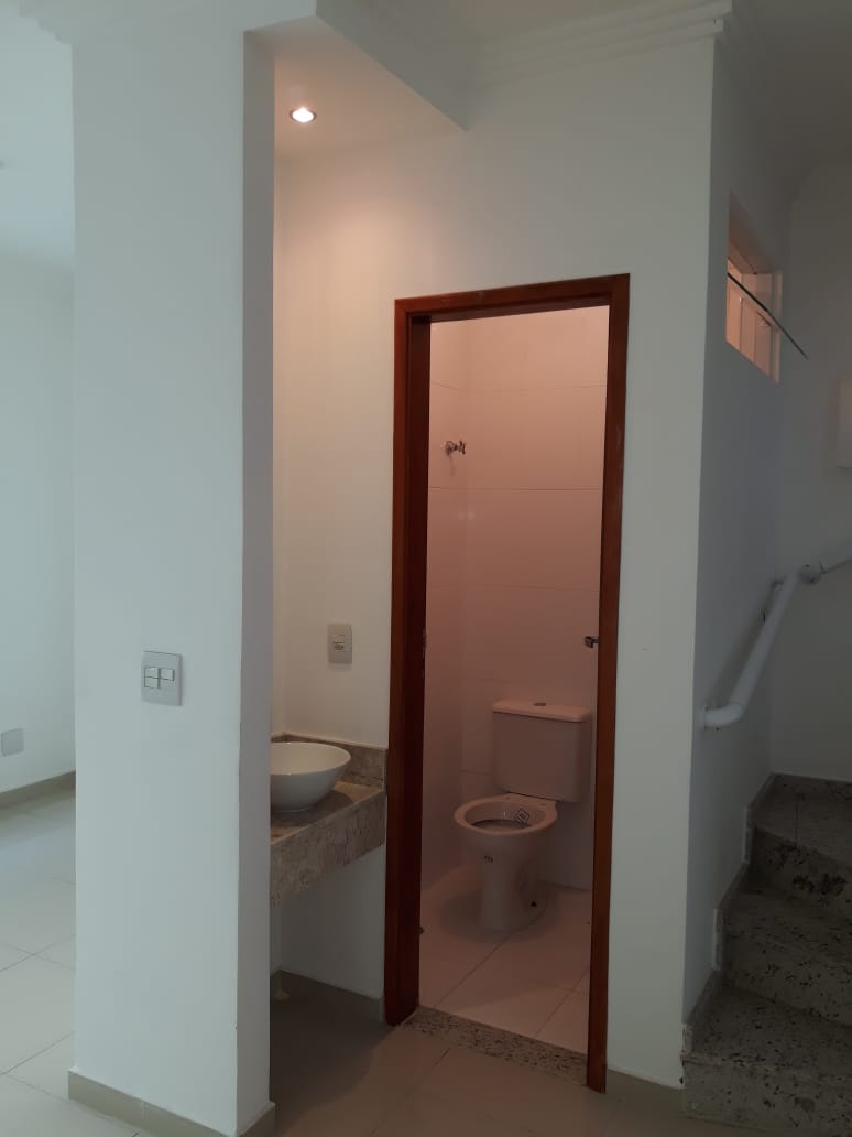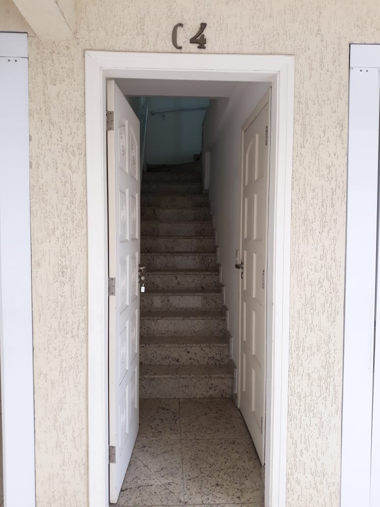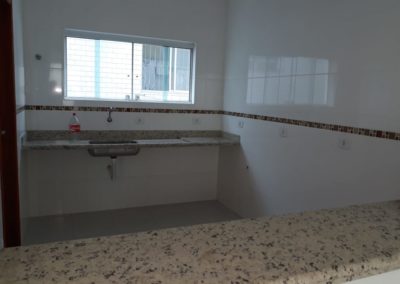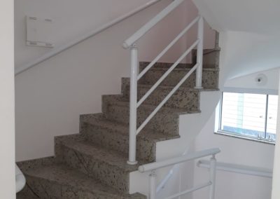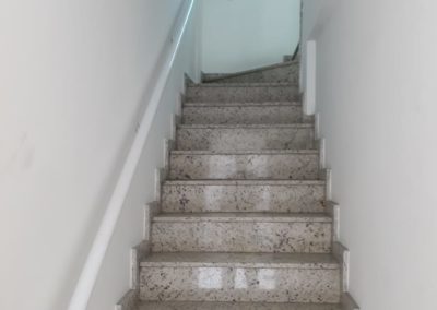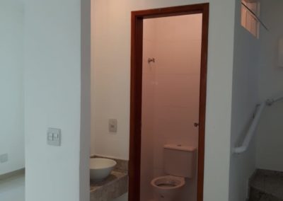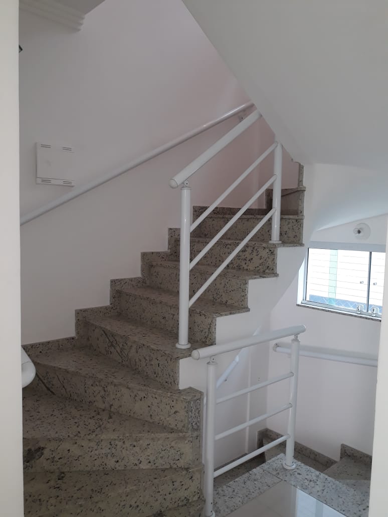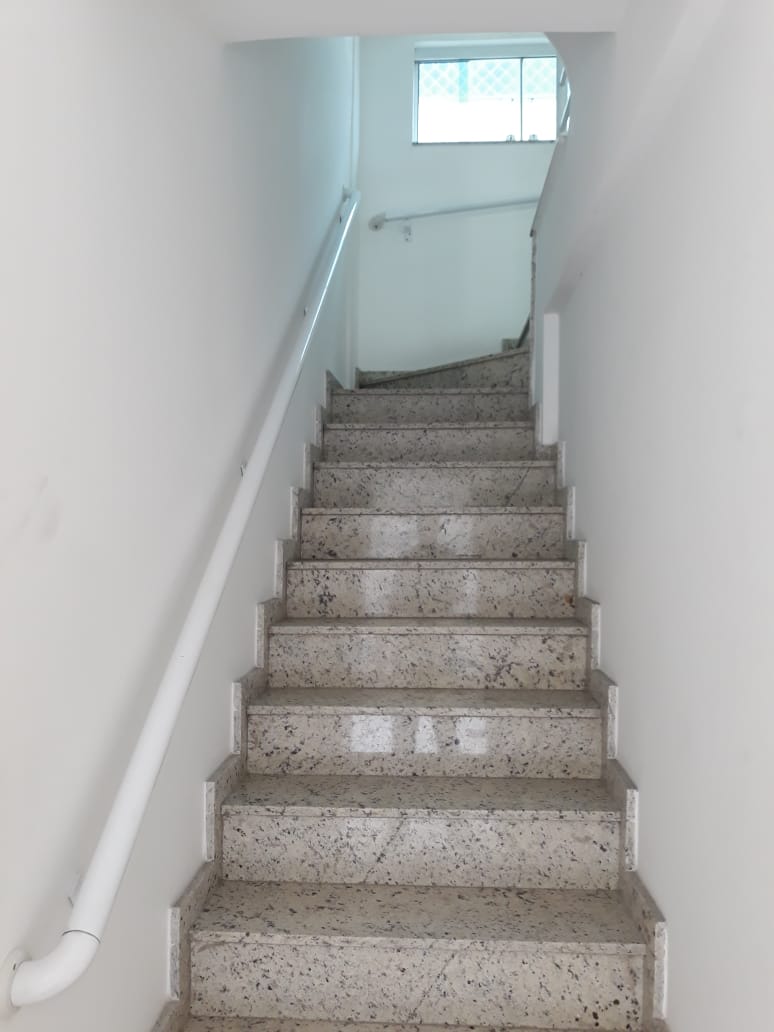 Escadaria em granito e corrimão em alumínio. Hall com lavabo, uma sala para até 2 ambientes, cozinha americana e área de serviço.